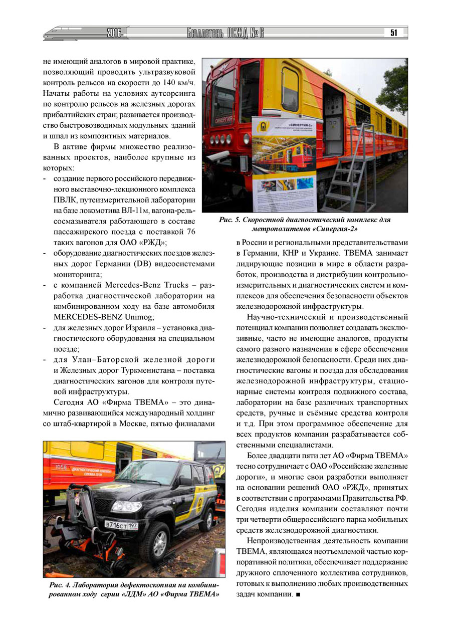 Like many other newly founded entities of modern Russia, the company has passed an uneasy way of its life. In 1989, specialists of a small private scientific and production association initiated their own developments of the perspective equipment in the field of railway safety. The consumer success of those products which followed soon inspired their creators and allowed to work with it directly in several scientific directions. Year after year, overcoming all difficulties of growth, creative frame of the company had beenformed, and a group of adherents of several generations and dynasties of employees was established. As a result of their common efforts TVEMA provided and today supports high competitiveness of its products in the railway diagnostics equipment market both in Russia and beyond its border.